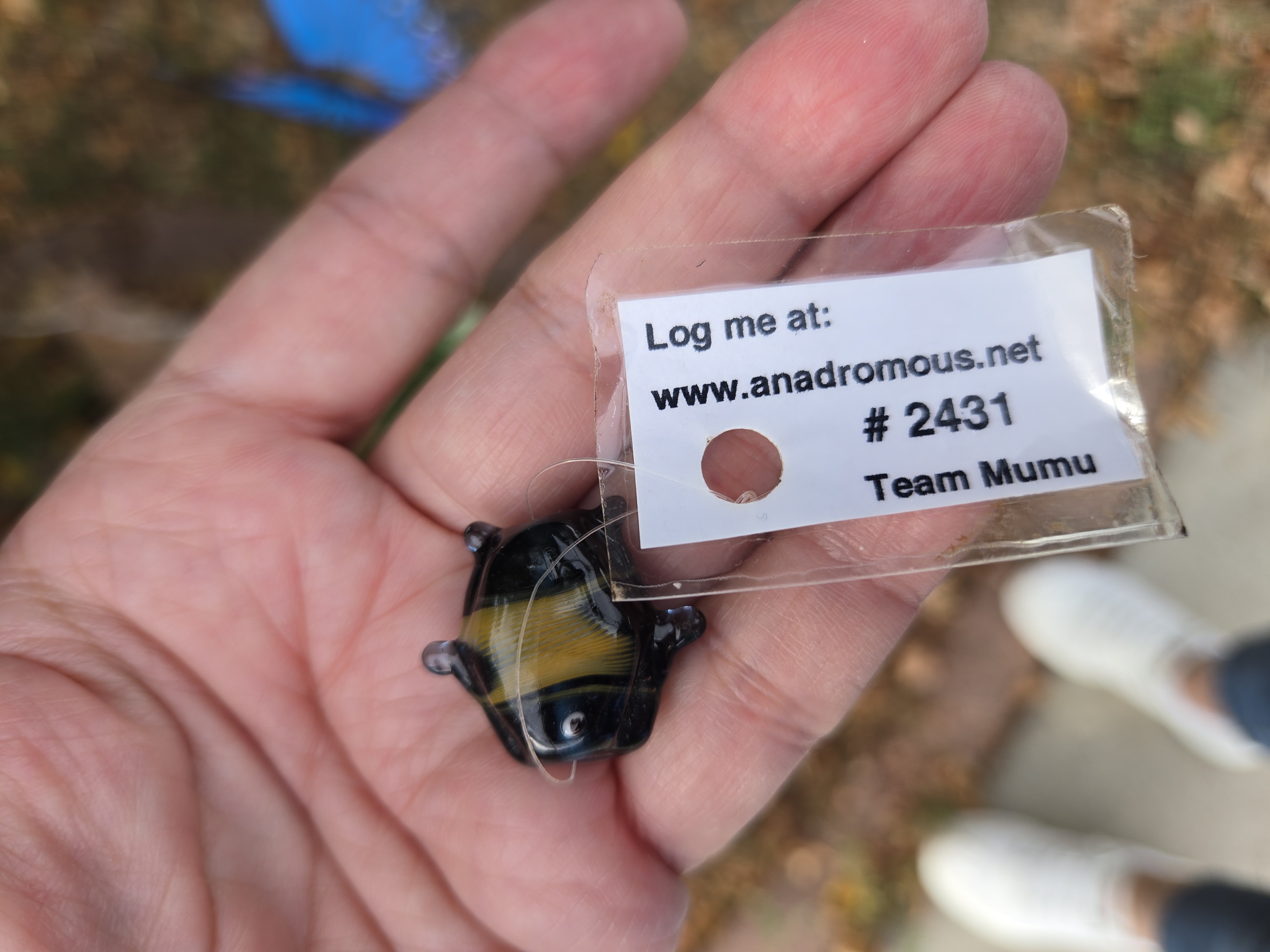 We launched these signature geocaching items in 2005 to celebrate find #600. After over 20 years and over 10,000 finds, there are thousands of mumu fish beads released into the world.